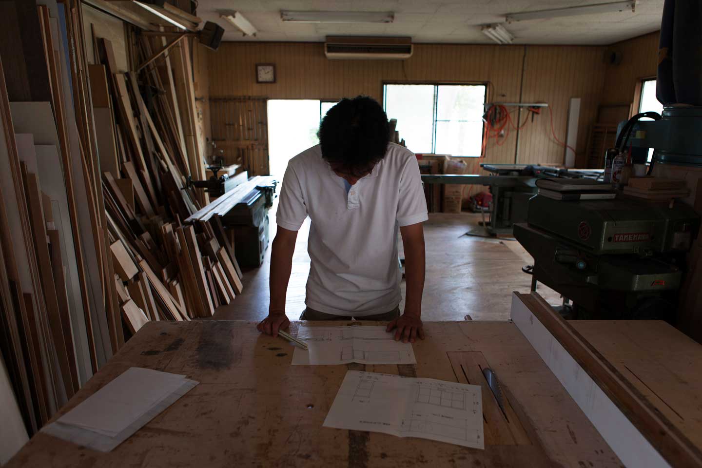 その後、図面工に転じ、製品の管理や製作の補助、見積りや工程管理などを担当するが、「もの作り」への欲求が強くなり、建具屋へ転身し、家具・建具の製作を習得。